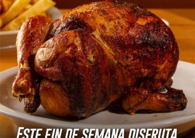 Con nuestro pollo, puedes elegir entre diferentes guarniciones como patatas panaderas, fritas, pimiento del piquillo asado en nuestro horno de leña, croquetas de pollo o gyozas con salsa de cilantro, entre otras. Además, ofrecemos postres muy suculentos como tarta de queso, brownie con nueces o tarta de Toblerone. Puedes llamarnos para recoger tu pedido en nuestro local o pedirlo a través de las principales plataformas como Just Eat, Uber Eats o Glovo.